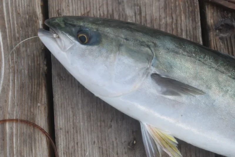 こうなれば左右に分かれて魚を引き離します。私のサオは剛腕タックルのため、あえて一気に引き寄せることにしました。すんなりと海面に姿を見せたのは、まずまずサイズのオリーブハマチ。