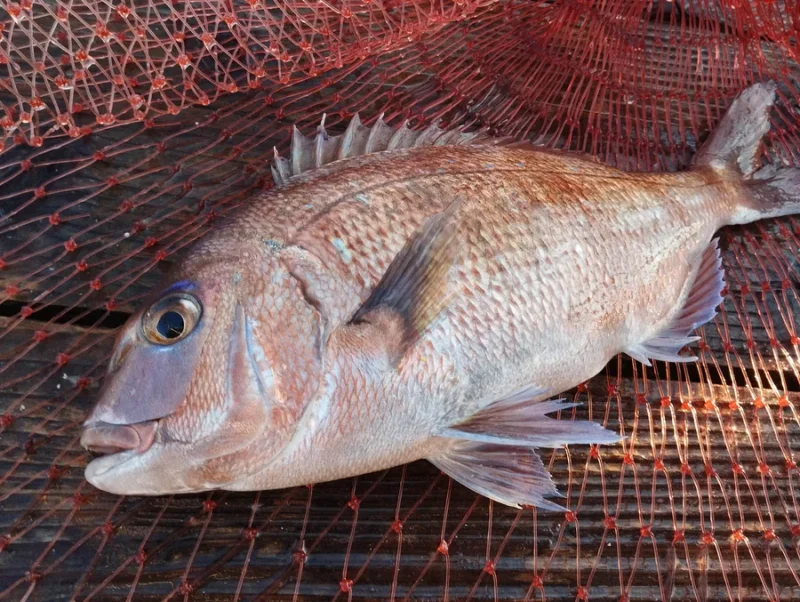 慎重に取り込んだマダイは、発色の綺麗なまずまずサイズ。
