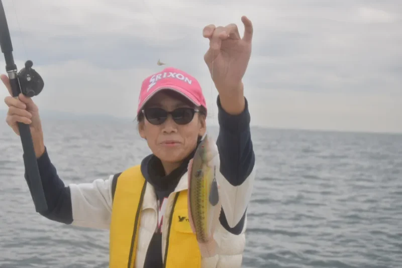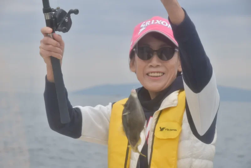 青ベラ連続ヒットのサピちゃんは、続いてキモパンのカワハギを釣り上げます。これには、ご本人も驚きは隠せません。