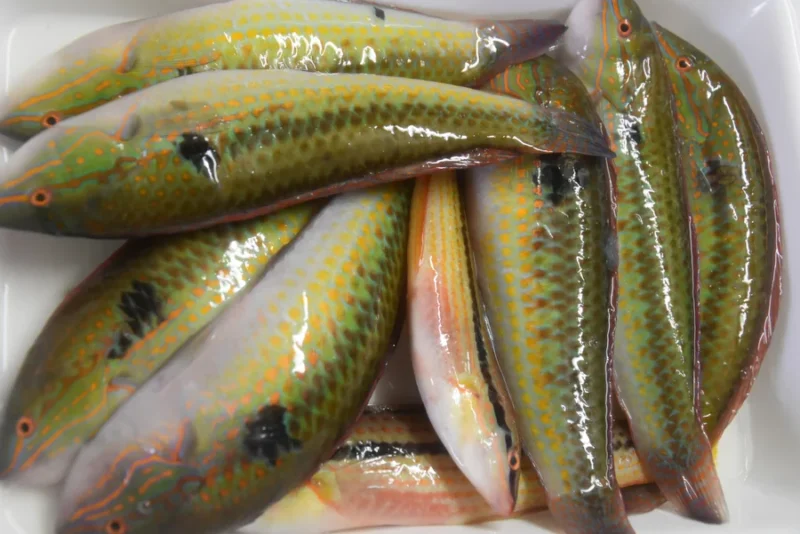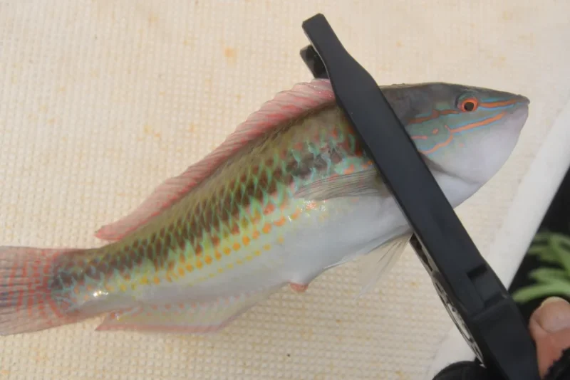 いよいよ釣りスタートです。タックルセットしていると、早速、ファーストフィッシュを釣り上げたのはサピちゃん。グッドサイズの青ベラです。