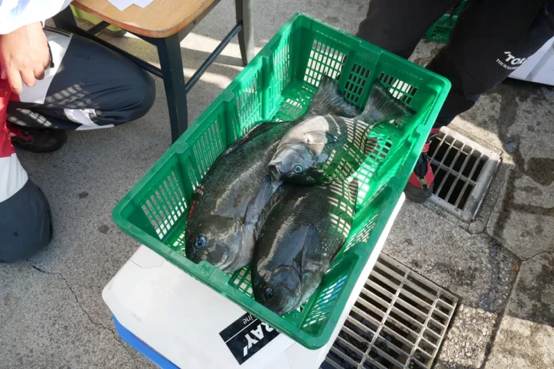 情報では、グレはよく釣れるものの小型が多いとのこと。試合が始まるとヒットするグレは全体に小型が多いものの、選手たちは釣技を駆使してその中から良型グレをキャッチ。検量には40cmオーバーのグレが何匹も持ち込まれました。