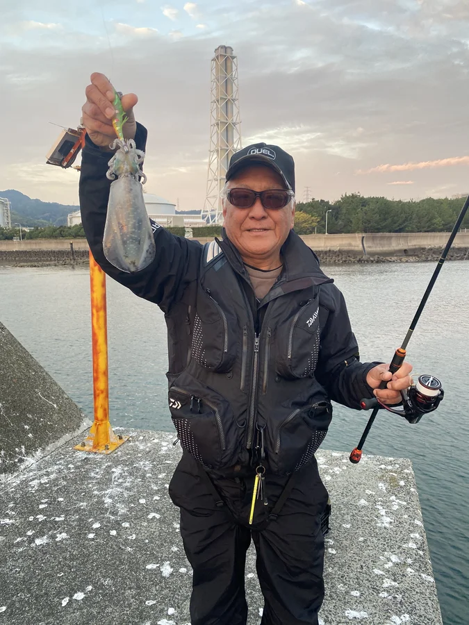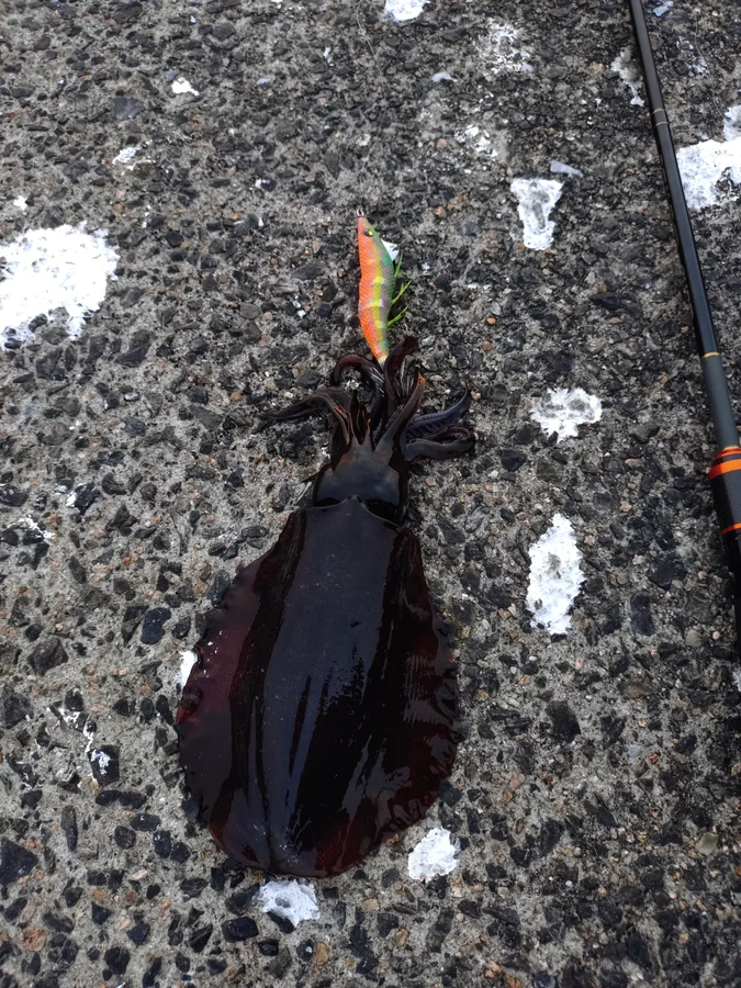 まずはアオリイカ狙いでデュエルのエギ『ダートマスター』3.0号からスタートです。ゆっくりエギを沈めていくとすぐにアオリイカの反応があり、トンカツオーバーサイズのアオリイカを3杯釣る事ができました。