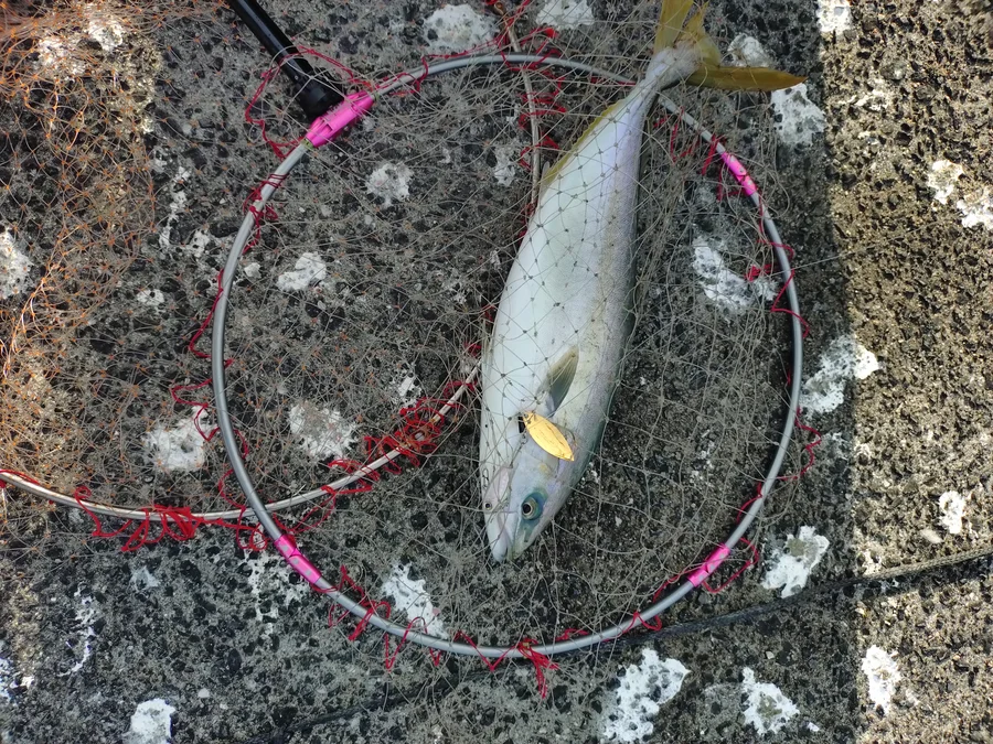 しばらくすると沖合にハマチのナブラが出てきたので、デュエル『ハードコア モンスターショット』65mmのピンクイワシをナブラに投入すると、1投目に来ました! ハマチ!!楽しすぎる釣果に感動しました。