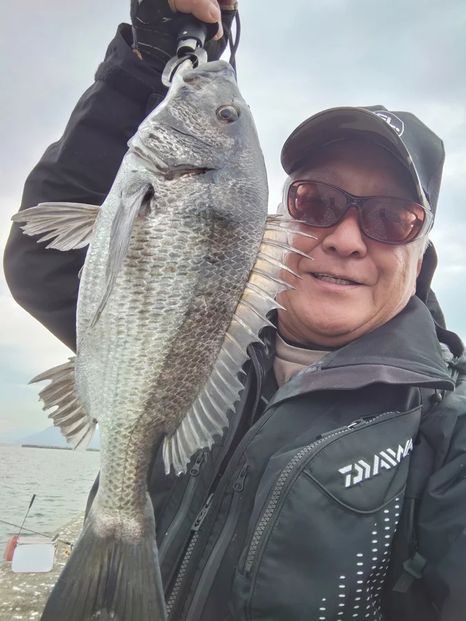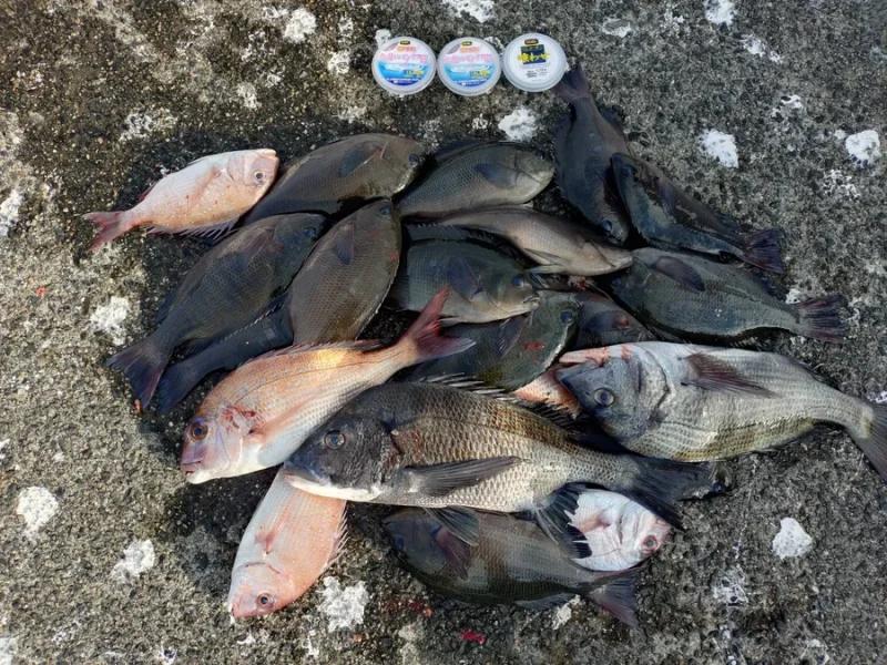 続いてのフカセ釣りでは25〜32cmまでのグレが2桁釣れ、チヌも38〜42cmを2枚釣れてお土産を確保しました。