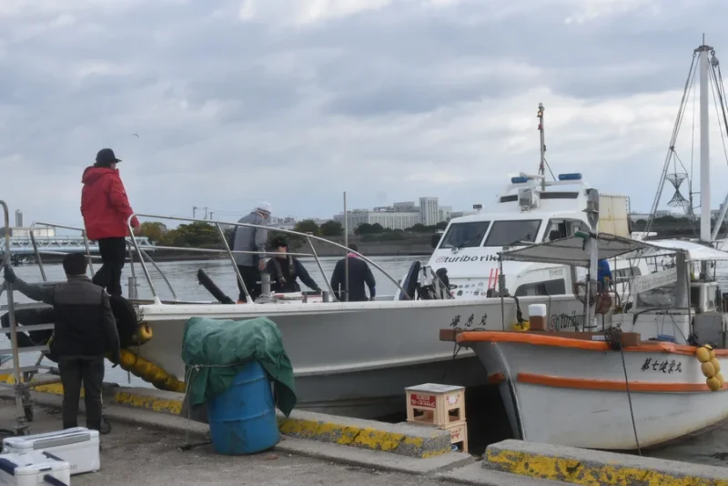 2本のロッドを収納したショートロッドケースと、いつもより小さい25Lクラー(調理済みフグの持ち帰りのため)を片手にまとめ、ショルダーバッグを肩に掛けて送迎船に乗り込みます。