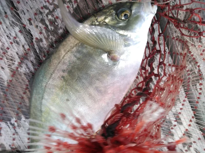 水深1.5mほどの回遊ルートを見極めてエサを見せて食わせて、エサが見えなくなったら即アワセをします。引き込みを待っていると鋭い歯でラインを切られてしまいます。