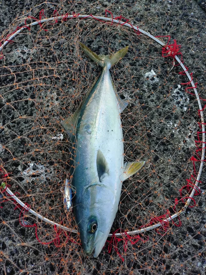 波止に渡ってすぐにハマチのナブラを発見! デュエル『ハードコア モンスターショット(S) 65mm』のケイブルーメッキを投入すると1投目に来ました!! ハマチゲット。幸先良いスタートとなりました。