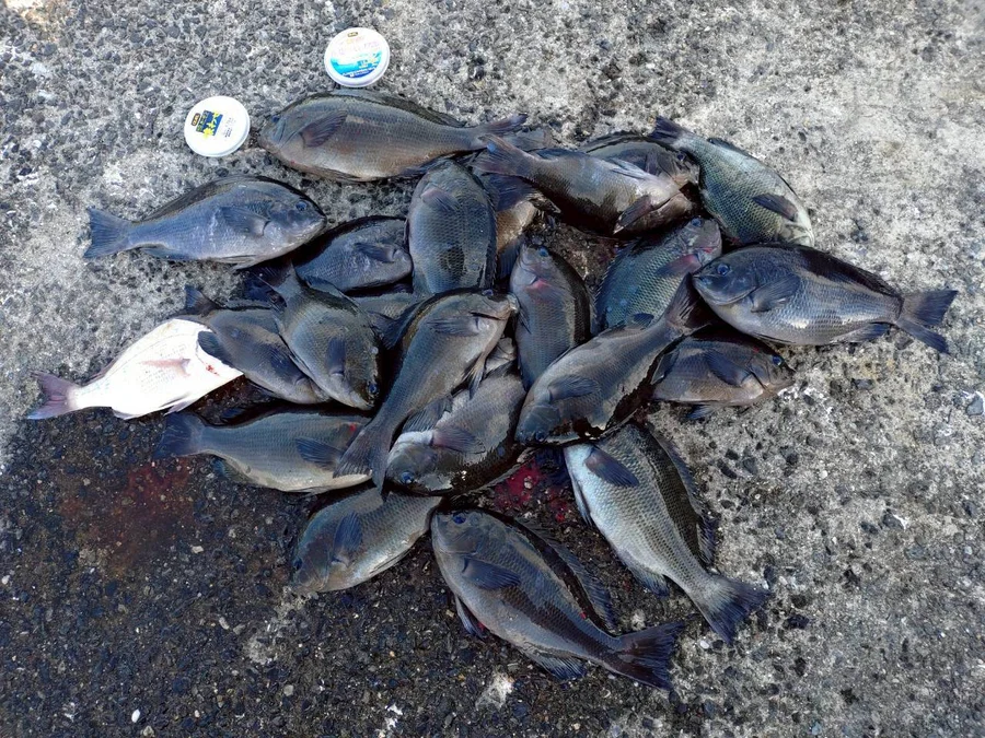 その後は、グレ釣りをしました。仕掛けはウキに『ウェーブマスターM』G2にハリス1.5号を3ヒロ取り、ガン玉5号2個調整で入れ食い突入! 25センチ〜33センチのグレを2桁釣ってお土産終了しました。