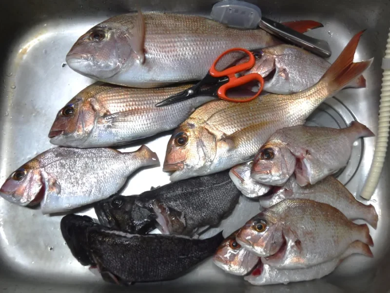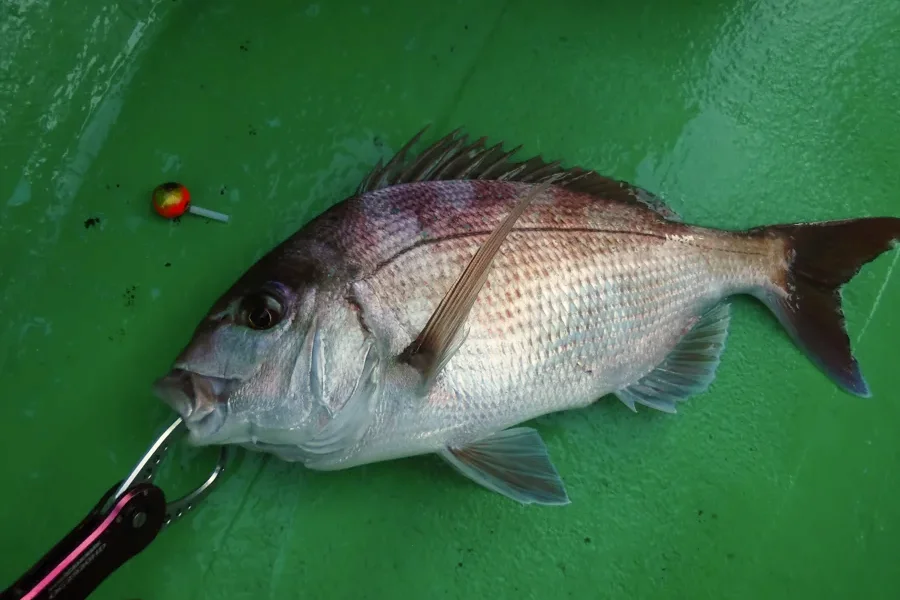 終了1時間前頃から若干沖に仕掛けが払い出すようになったので、トレーラーワームを投入すると、キャストしてからの斜め引きに立て続けに800g程の真鯛が連続ヒットしました。