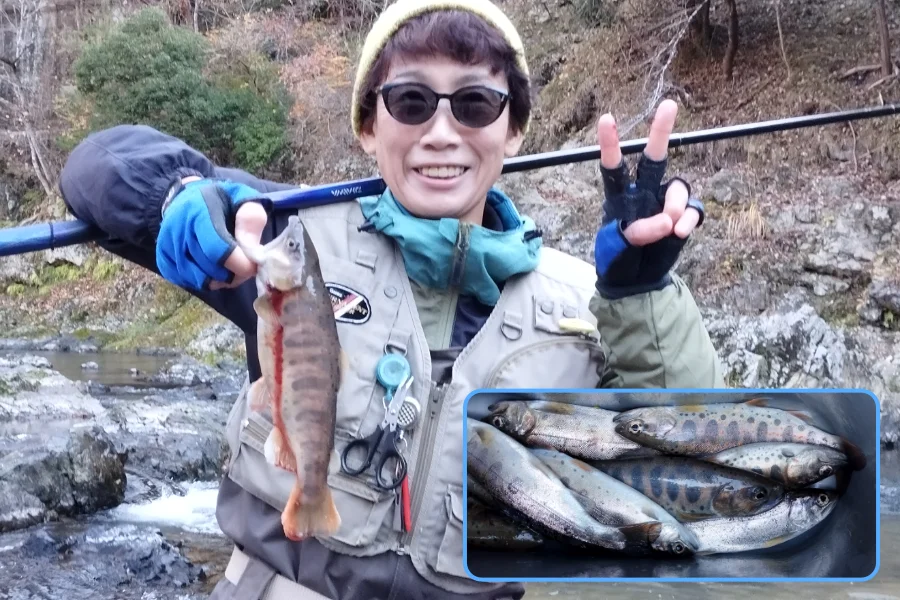 当日は、早朝の寒気もあって午前10時前辺りから釣果が出始めました。綺麗なアマゴやポイントによってはニジマスも良く釣れていました。
