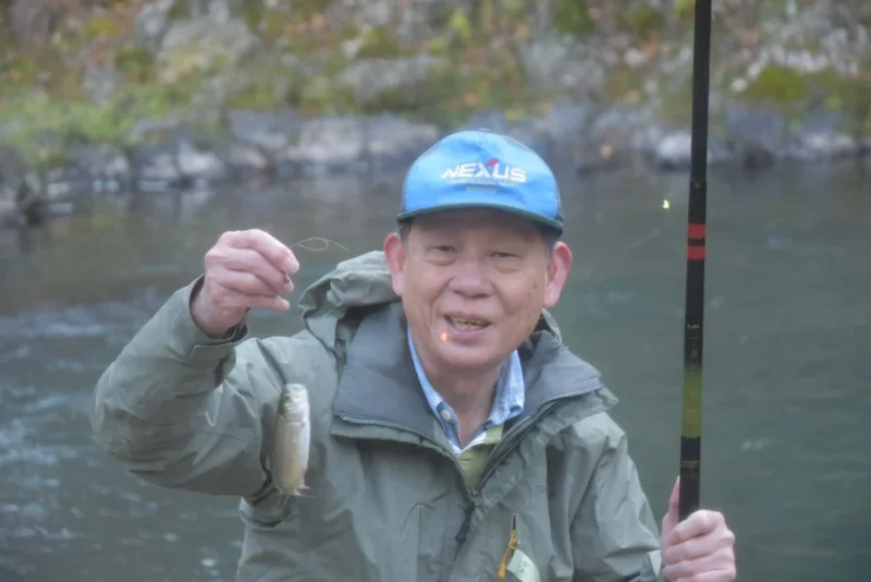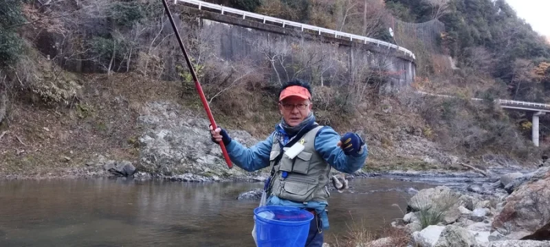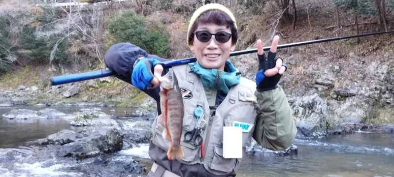 次々とヒットするアマゴを手際良く釣り上げるダーリンは、細仕掛けのゼロ釣法でナチュラルに流し、食わせて、ハリ掛かりにこだわるベテラン渓流釣り師。
