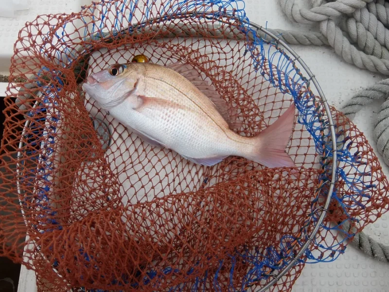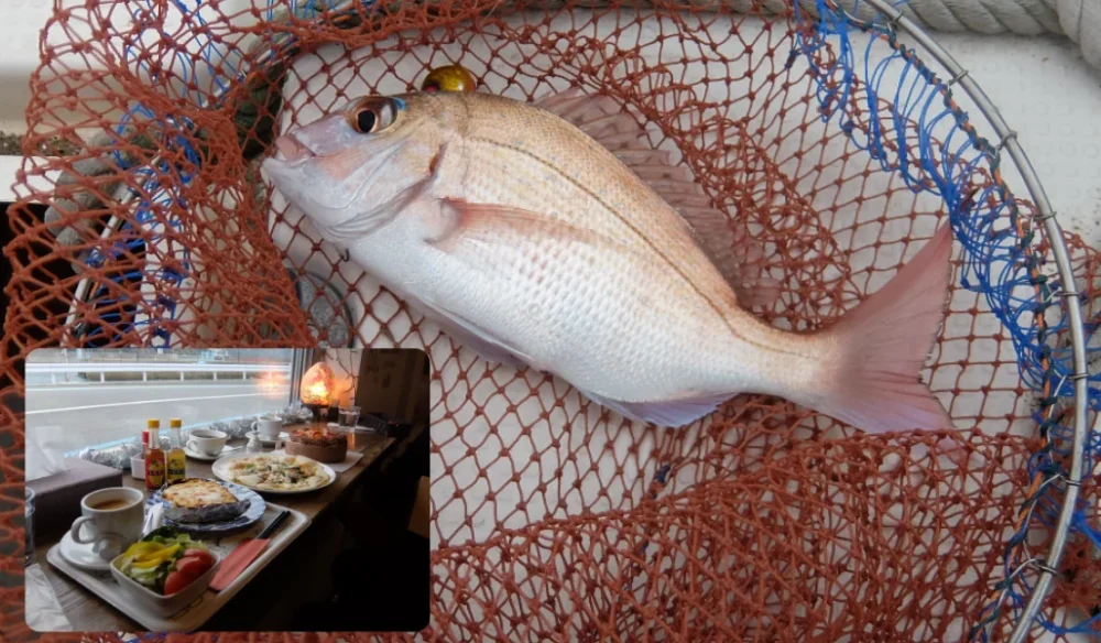 ここはなんとかPEが立つ。PEが立ってほっとしてしばらくした時、『小継金剛』の鋭敏な竿先が叩かれた。下から5mを探っていたので、「もしかしたらアコウかも……」。水面に来てくるくると弧を描いたのは綺麗な40cm程の真鯛。オーナーが先の四角いタモで掬ってくれました。