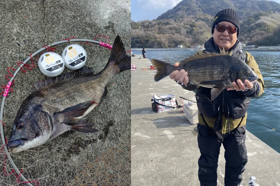 今回の掛けは波止場の水深が深いので、ウキ下は竿2本半からスタート。竿3本までのタナでチヌがヒットしてきました。