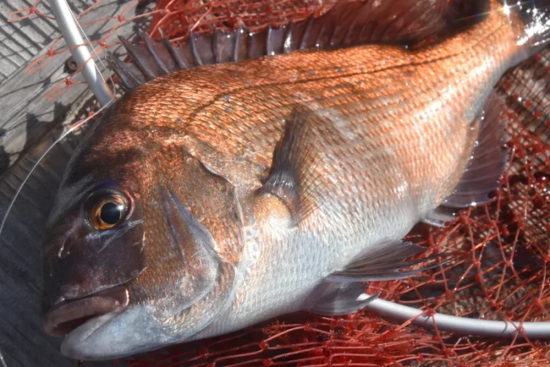 我慢も限界です。外道覚悟でイワシを半身にし投入すると、一気に食い込みアタリが出ます! しかし、本命の青物ではなぐ大マダイ。まあ良しとしましょう!