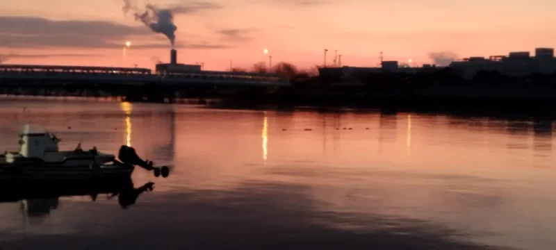 寒気刺す朝明けの網干港(姫路市)は、徐々に朝日に染まりとても綺麗です。今回は、海上釣り堀「海の釣り堀 海恵」でのトラフグとの対決です。