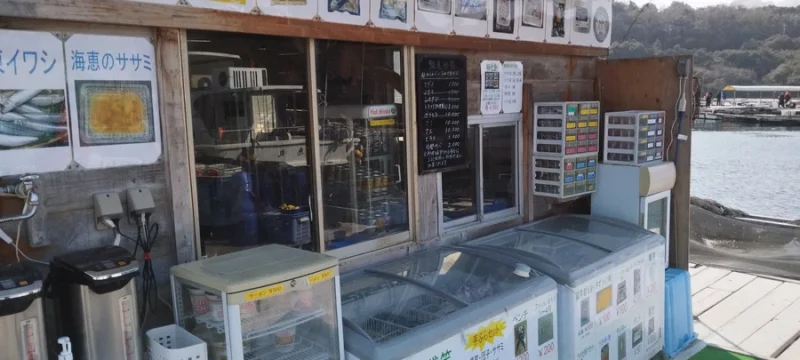 受付・売店には、生きエサ(生きアジ)や各種練エサ、仕掛けをはじめ、飲み物や温かいカップラーメンなどいろいろな小物までが販売されています。驚いたことに瞬間接着剤まで販売されていました。気配り満点ですね。