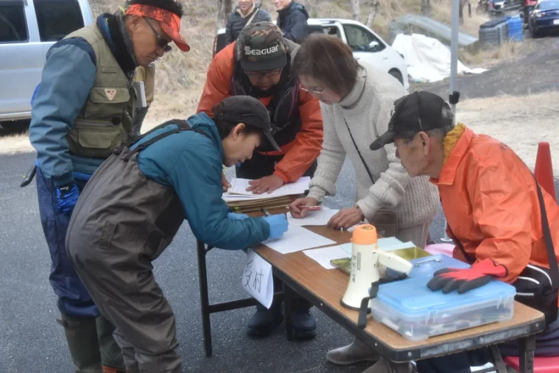 受付時間が迫るとエントリーの長列が続き、猪名川漁協会員をはじめ京都・大阪・神戸・姫路ナンバーの車で駐車場が満車となるなか、午前8時30分にいよいよ受付がスタート。