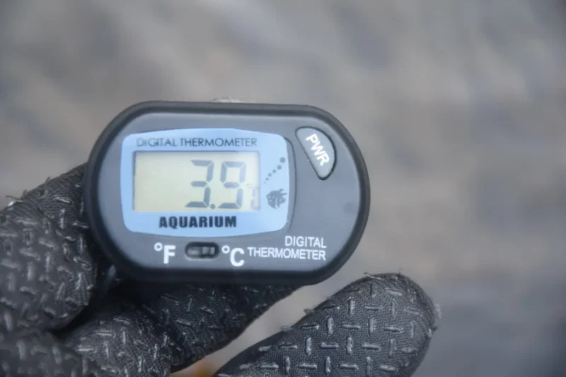 大会スタート時間は午前10時ジャスト。一斉に第1投が放たれますが、上・下流は共にサオ先がなかなか弧を描きません。水温は、なんと3.9℃! 群れている魚影が釣り人へ葛藤を誘います。