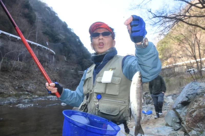 そんな中、上流部の常連さんが見事にやる気のあるアマゴを釣り上げると、魚たちにスイッチが入ったのか、あちらこちらでニジマスやアマゴが宙を舞い、タモに収まり始めました。