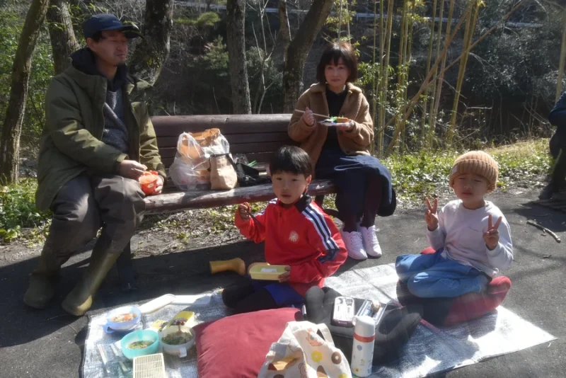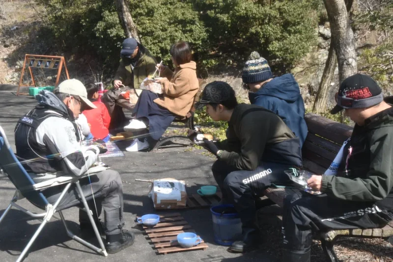 あちらこちらでピクニック気分を思わせる温かい豚汁と助六のお寿司セットの昼食が振舞われ、釣り仲間で会食を共にするグループ、ちびっ子ファミリーなどと、「川の案内所」の横のベンチは、くつろぎ食堂の賑いを見せました。