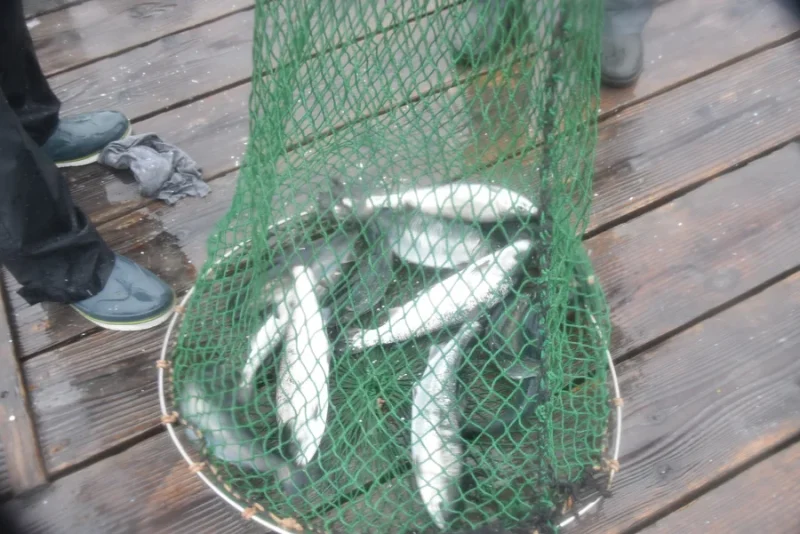 2回目の追加放流後は、1匹を追加し6匹釣果。サクラマスも下げの潮流に逆らうように上層を回遊し始めました。当然こうなると、エサ釣りの縦のフォール&リフトのサソイより回遊レンジにターゲットを絞ったスイミングアクションに反応するサクラマスが多くなってきたようです。