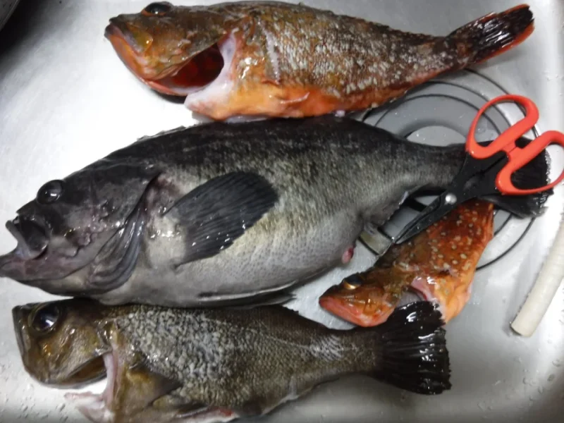 その後も、良型のカサゴや抱卵個体の沖メバル、小型のカサゴがヒットしましたが、抱卵個体や小型の魚は持って帰っても仕方ないので、エアーを抜いて全てリリースしました。