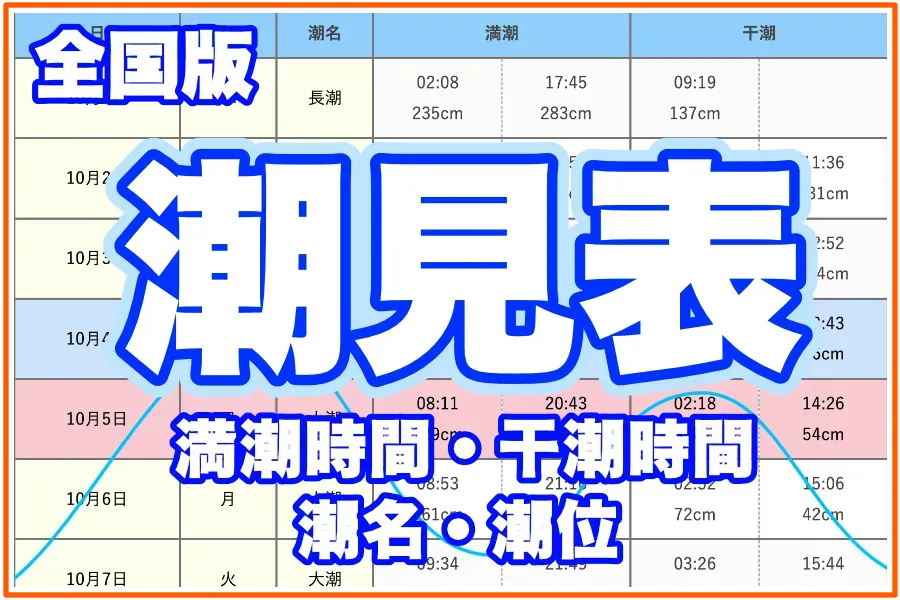 各月の満潮と干潮の時間と潮位、潮名を表示する潮見表(潮汐表)。全国239ヶ所の潮汐情報を表示。釣りやレジャーでご利用ください。